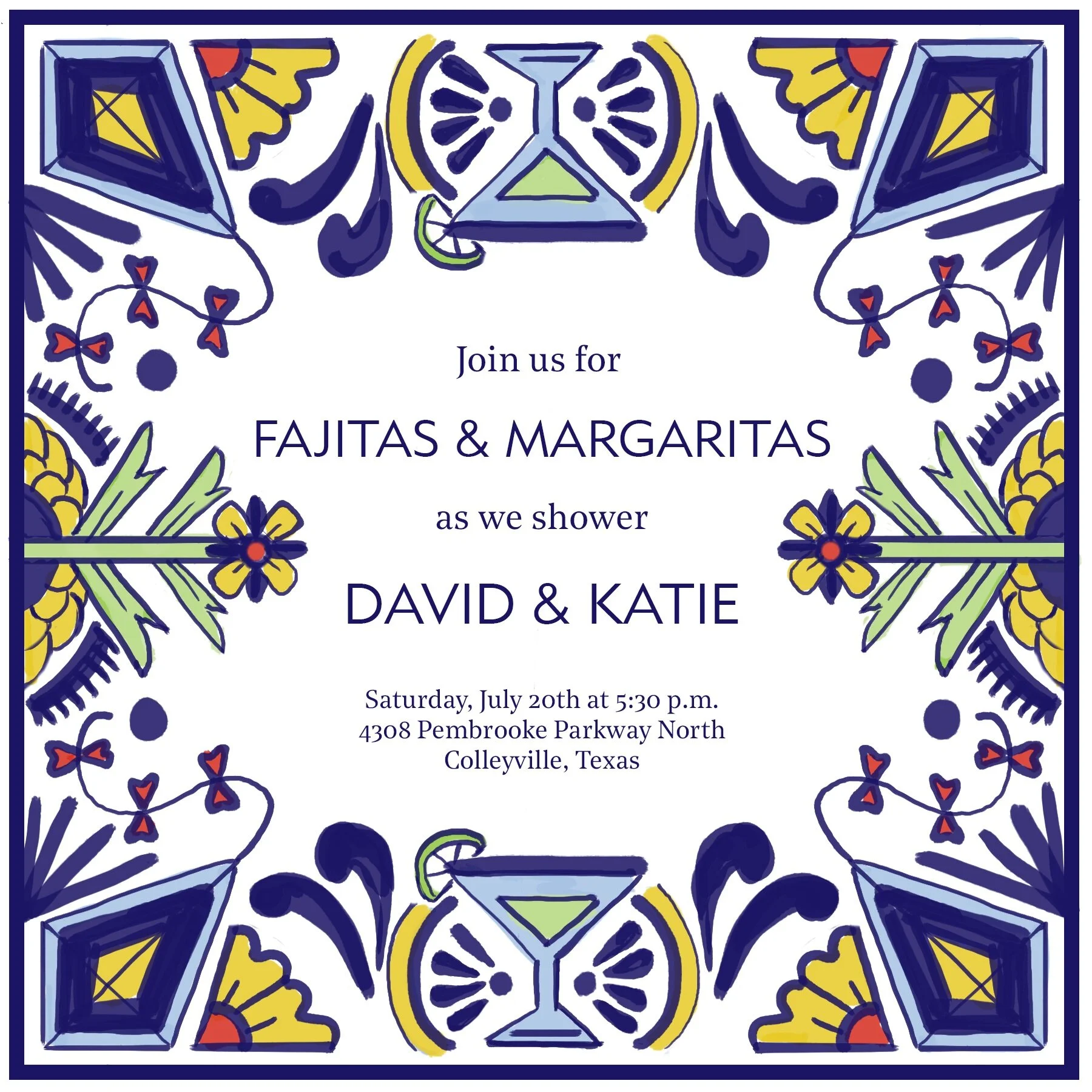 The hand-painted brushwork, sunny earthen color palette, and square aspect ratio recall the artistry of Mexican talavera tile, an art form celebrated and frequently seen in the couple’s hometown.